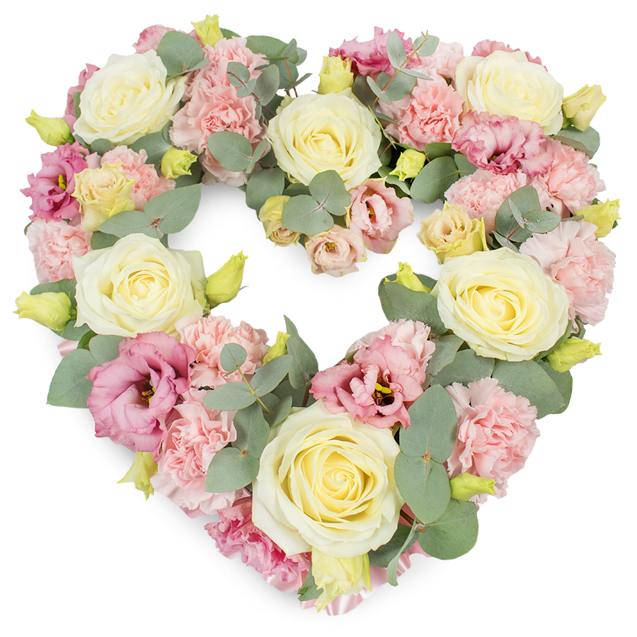 Honor cherished memories with our Graceful Memory Heart Arrangement. This stunning and unique bouquet features elegant white roses, soft pink carnations, delicate pink lisianthus, and fragrant eucalyptus leaves, meticulously arranged to convey your heartfelt emotions.
